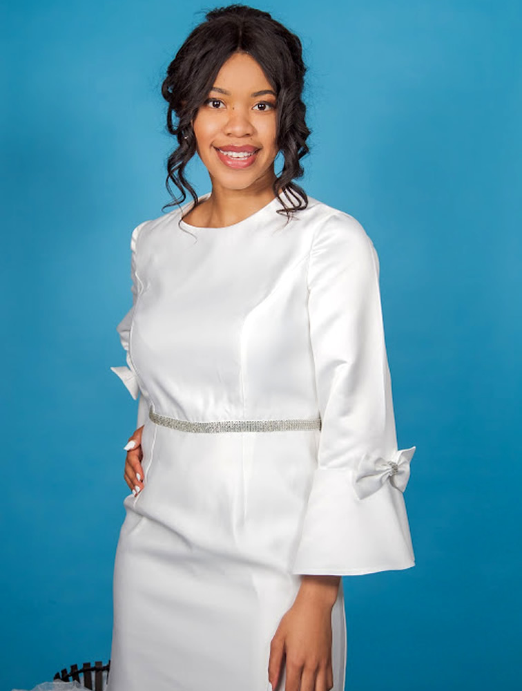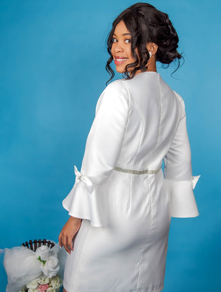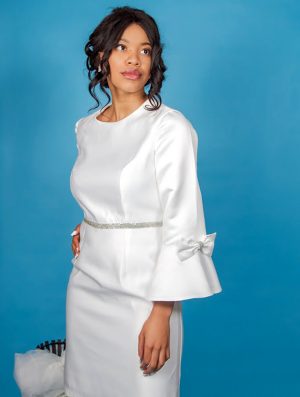 An eloquent shift dress with funnel sleeve decorated with a bow on the arm and a shiny trim around the waist, Carmen Confirmation Dress.