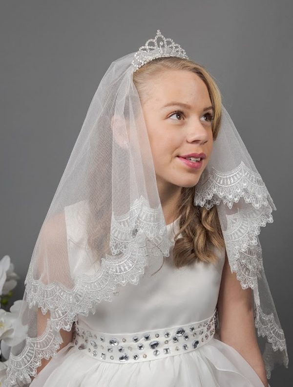 Princess Tiara Lace Veil – A tiara communion veil with a lovely silver lace trim